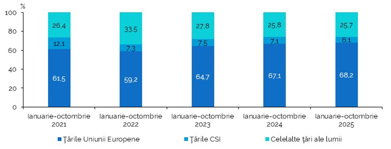 Exporturile de mărfuri destinate țărilor Uniunii Europene au totalizat, în perioada menționată, 2.06 miliarde de dolari SUA, fiind în creștere cu 4.4% și deținând o pondere de 68.2% în totalul exporturilor, cu 1.1 puncte procentuale mai mult față de ianuarie–octombrie 2024.
