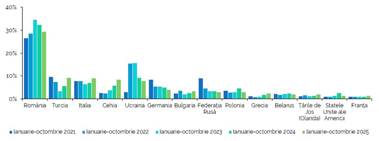 În topul țărilor de origine a importurilor se mențin România (22.3%), China (13.5%), Ucraina (10.4%), Turcia și Germania (câte 7%).