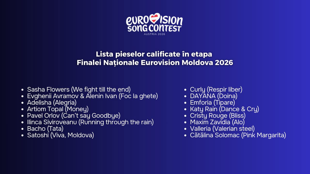 Șaisprezece artiști vor concura în Finala Națională Eurovision 2026. Aceștia au fost selectați, pe 16 decembrie, în urma audițiilor live, organizate în cadrul Selecției Naționale Eurovision 2026.