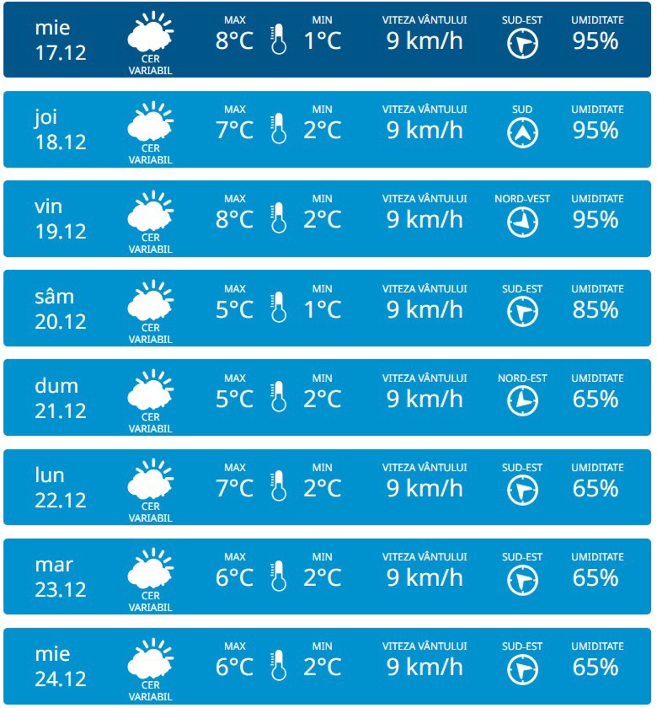 Conform datelor meteorologilor, noaptea termometrele vor înregistra până la 2 grade Celsius, iar ziua, pe 18 decembrie, vor fi cel mult 7 grade.