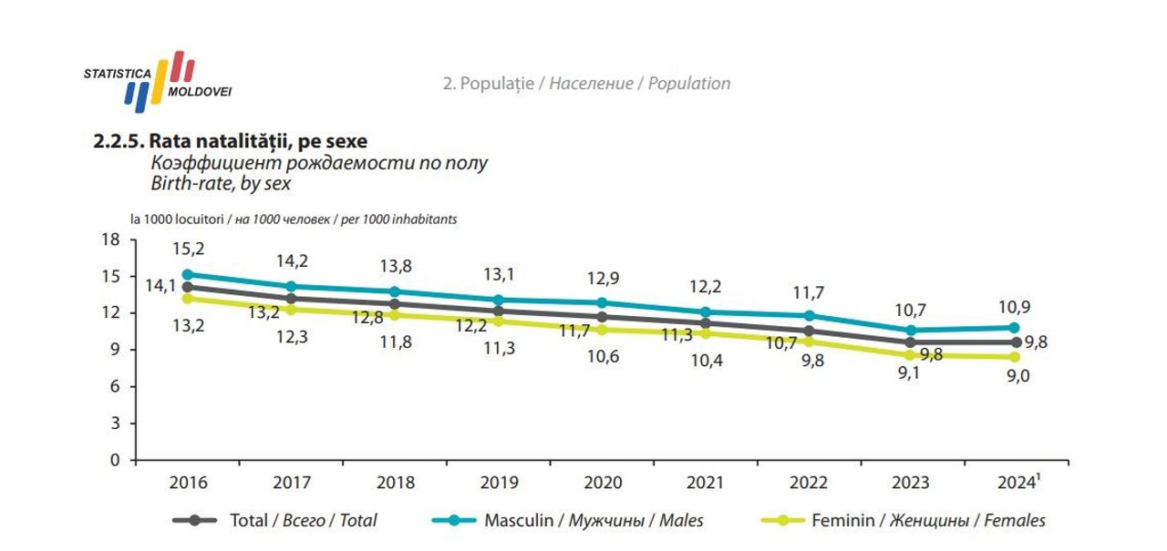 Datele [Biroului Național de Statistică] (https://statistica.gov.md/files/files/publicatii_electronice/Anuar_Statistic/2025/Anuar_2025.pdf) arată că Republica Moldova înregistrează constant mai multe decese decât nașteri. Anual, se nasc aproximativ 24-25 de mii de copii, în timp ce numărul deceselor depășește 35-36 de mii, ceea ce menține sporul natural pe un trend negativ.