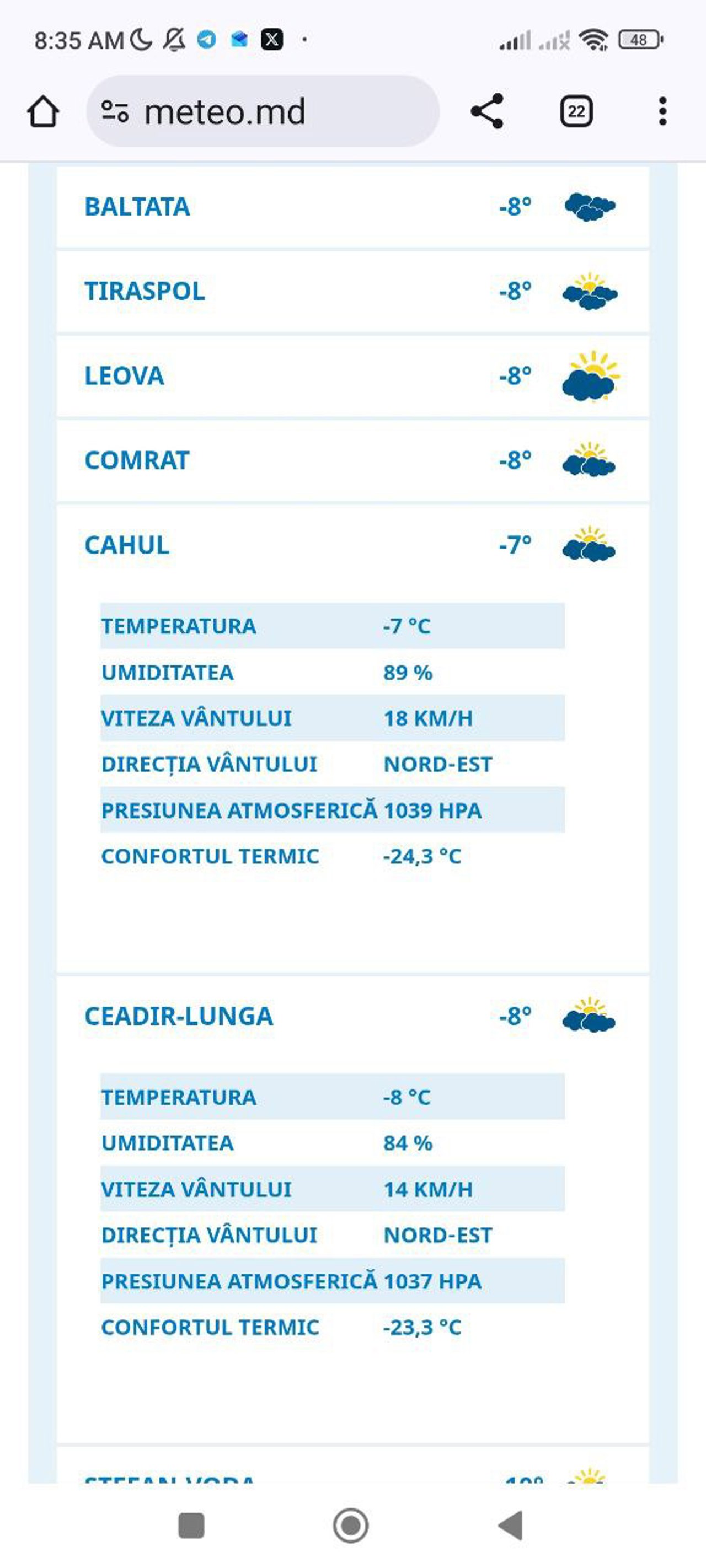 Menționăm că pentru joi, 25 decembrie, este în vigoare avertizarea Cod galben de scădere a temperaturii medii zilnice, emisă de Serviciul Hidrometeorologic de Stat.