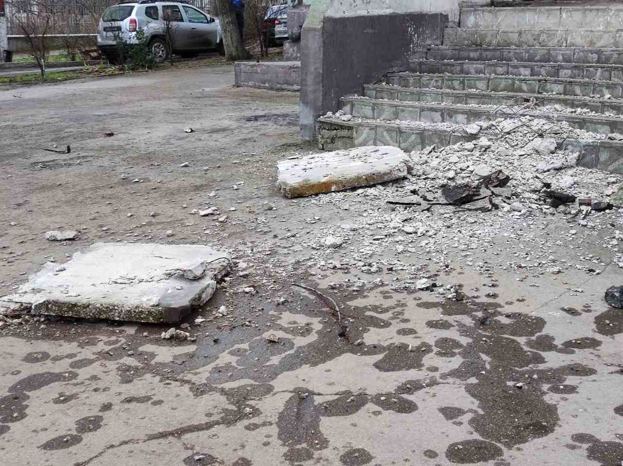 Salvatorii din capitală au intervenit și pe strada Nicolae Costin, după ce în curtea unui bloc au căzut câteva plăci de beton de la etajului 11, care serveau ca parapet al balconului comun. Au fost întreprinse acțiuni de verificare, salvatorii asigurându-se că balconul este bine fixat și nu prezintă pericol de prăbușire.