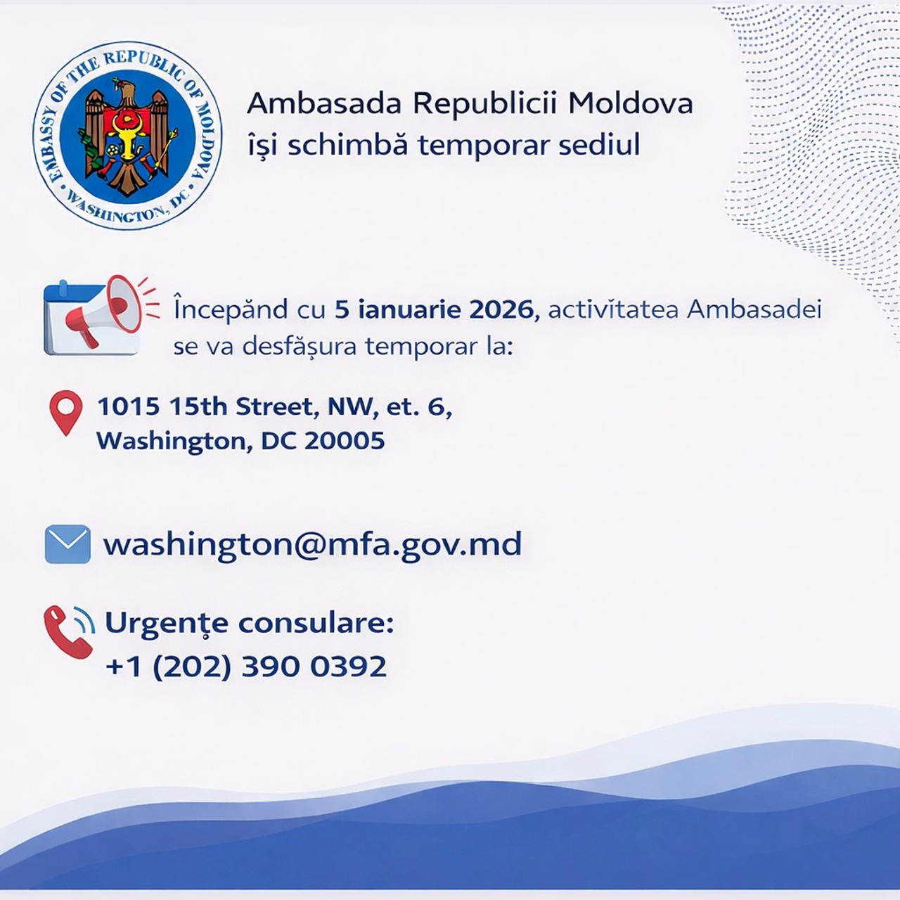 În atenția cetățenilor moldoveni din Statele Unite ale Americii (SUA)! Activitatea Ambasadei R. Moldova în SUA va fi relocată, pentru o perioadă estimată de trei - cinci luni, la o altă adresă, din data de 5 ianuarie.