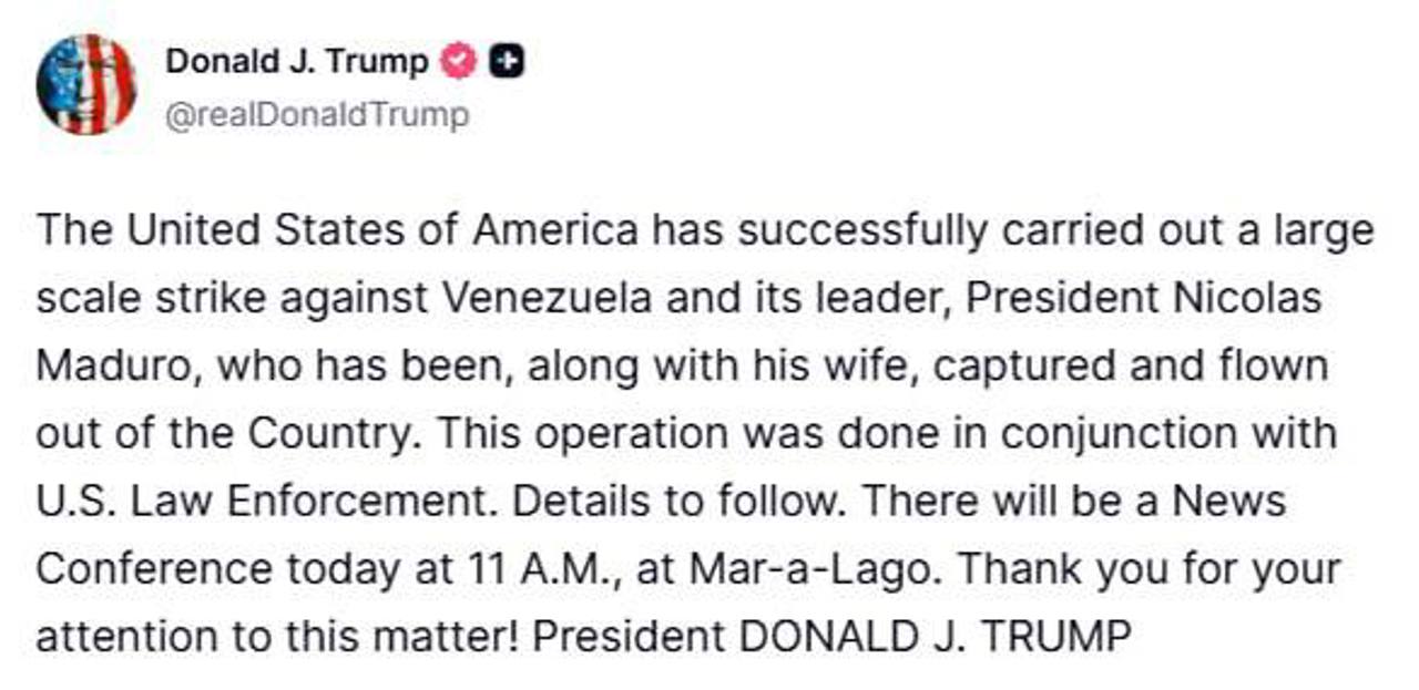"США успешно провели масштабный удар по Венесуэле и ее лидеру, президенту Николасу Мадуро, который вместе со своей супругой был захвачен и вывезен из страны. Операция проводилась совместно с правоохранительными органами США. Подробности будут сообщены позже. Пресс-конференция состоится сегодня в 11:00 по местному времени (18:00 по Молдове — прим. ред.) в резиденции Мар-а-Лаго»", - написал президент США в Truth Social.