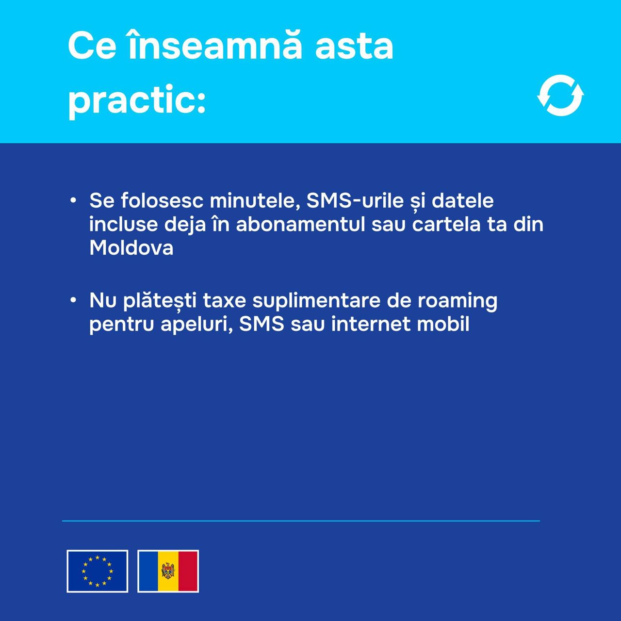 Astfel, cetățenii vor folosi, atunci când se vor afla în state UE, minutele, SMS-urile și datele incluse deja în abonamentul sau cartela din R. Moldova.
