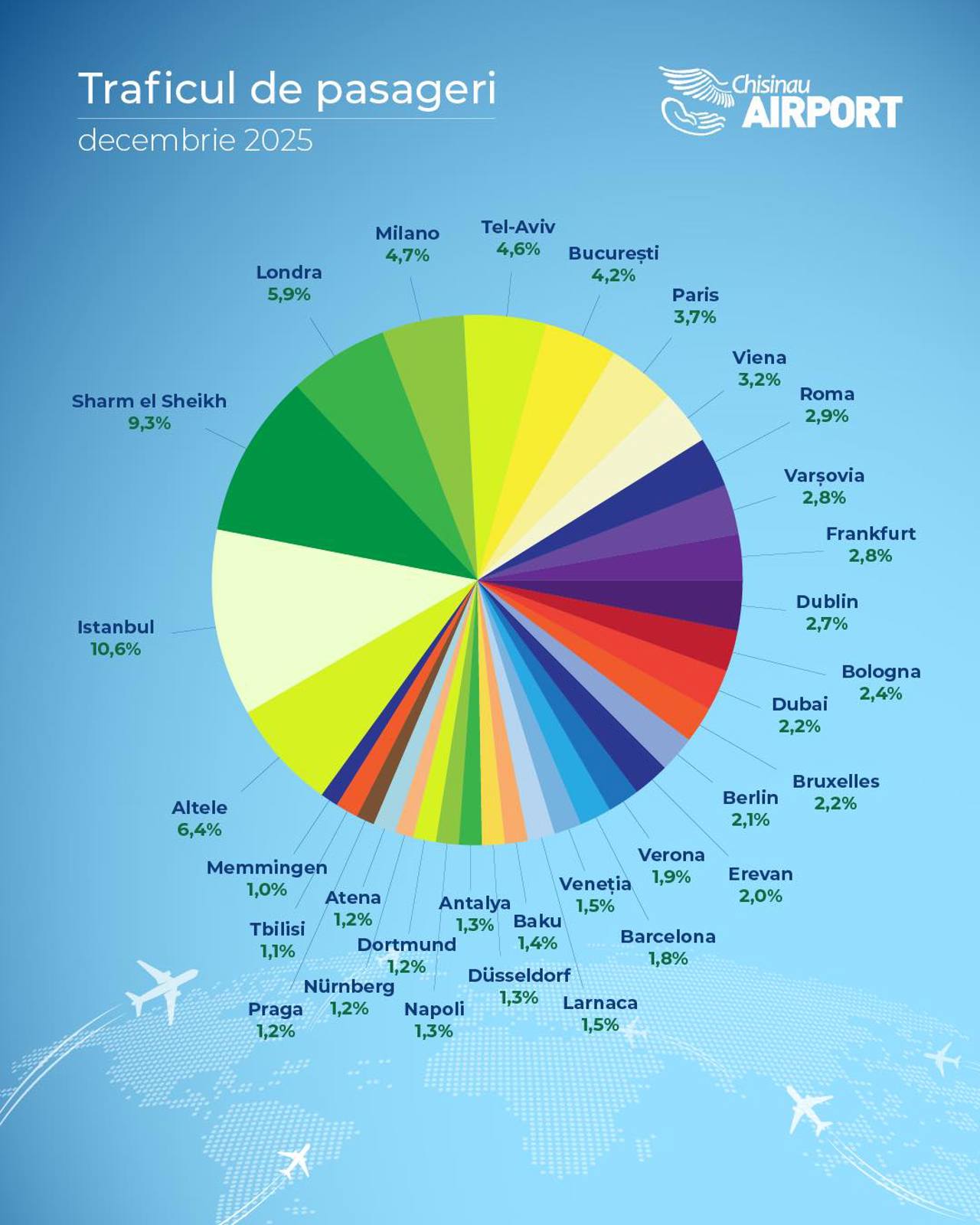 Doar în decembrie, fluxul de pasageri a constituit aproximativ 470 de mii de persoane, fiind operate 3.664 de zboruri.