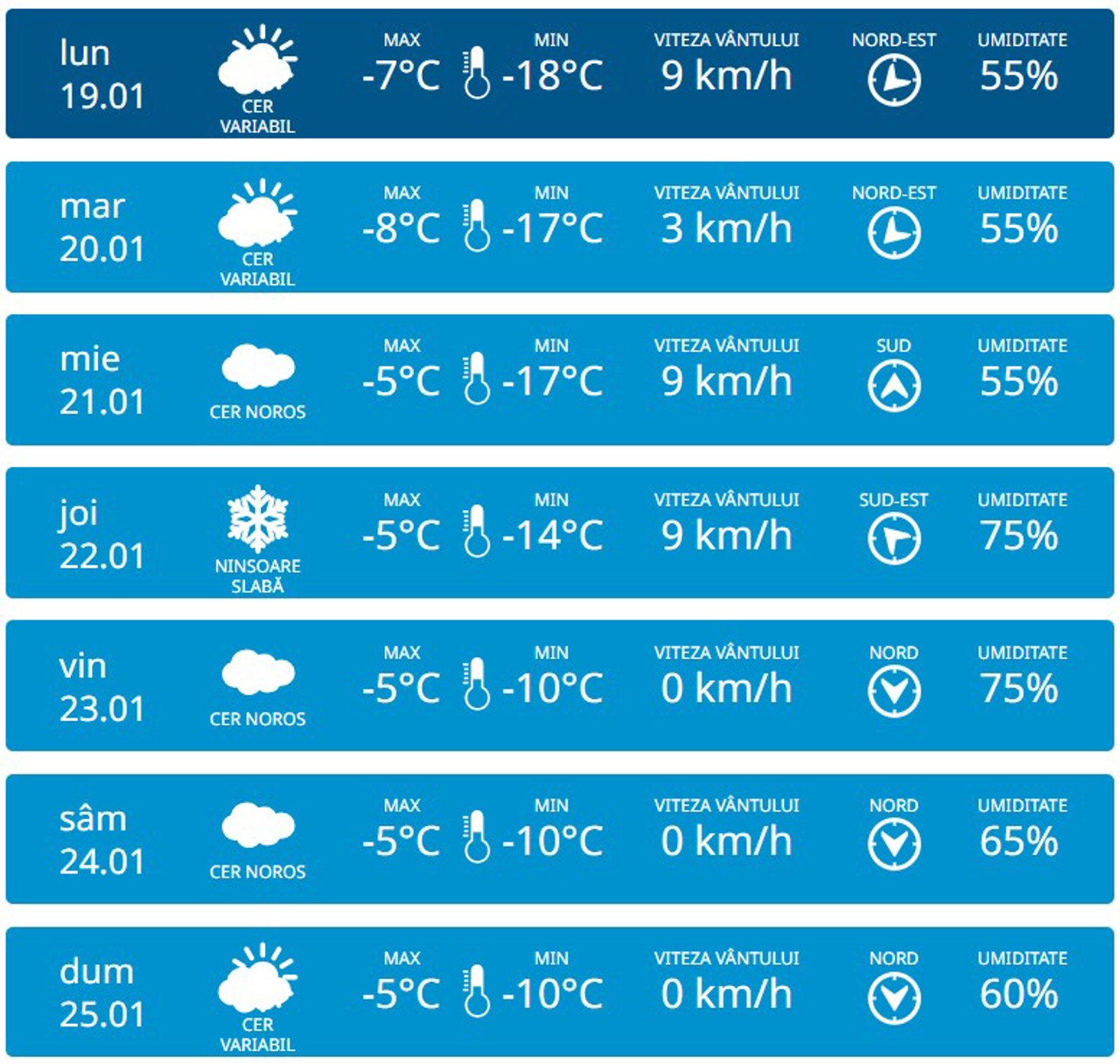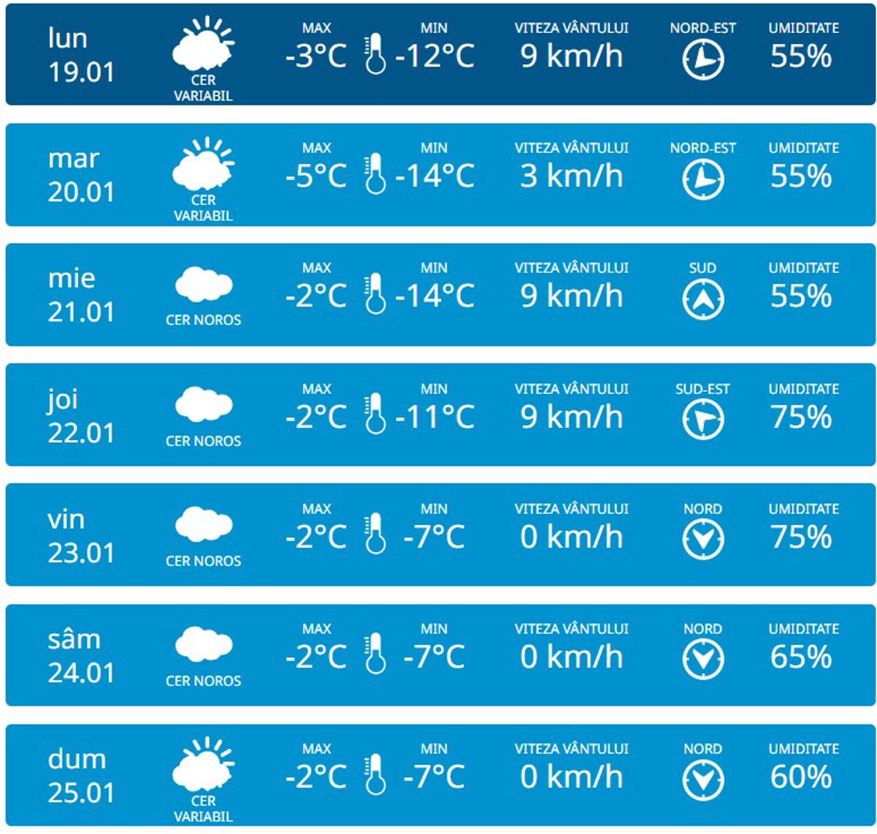 Pentru ziua de joi, 22 ianuarie, sunt anunțate precipitații slabe, iar până duminică maximele vor scădea până la -5 grade Celsius pe parcursul zilei.