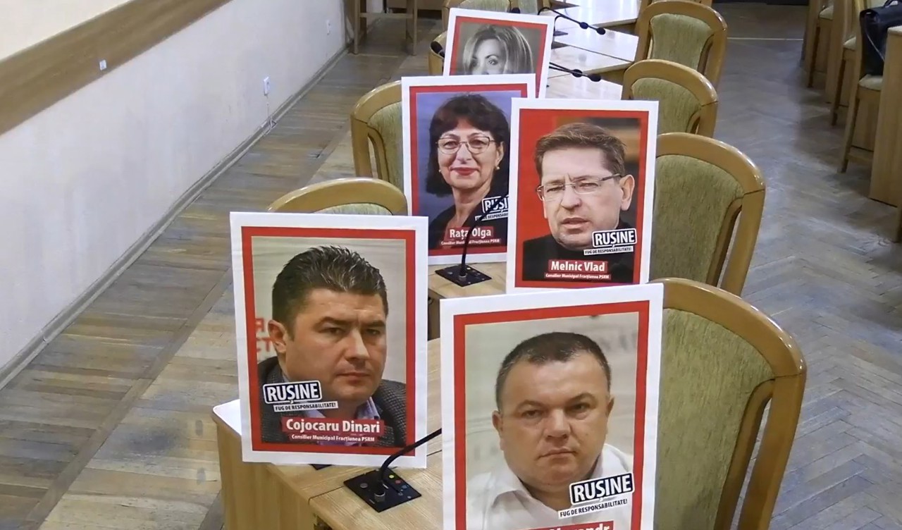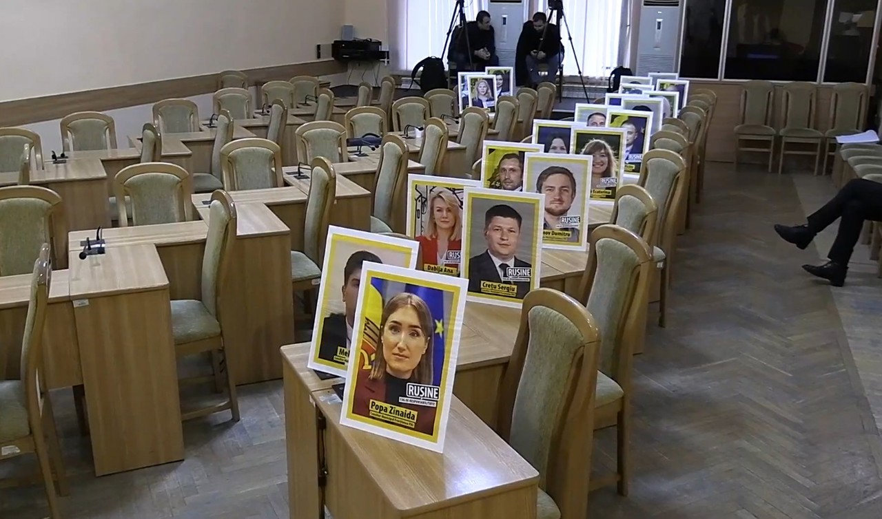 Pentru a evidenția absența consilierilor PAS și PSRM, consilierii Mișcării Alternativa Națională (MAN), condusă de primarul capitalei, Ion Ceban, au plasat pe locurile acestora portrete cu chipul aleșilor locali, fiecare purtând inscripția: „Rușine”.