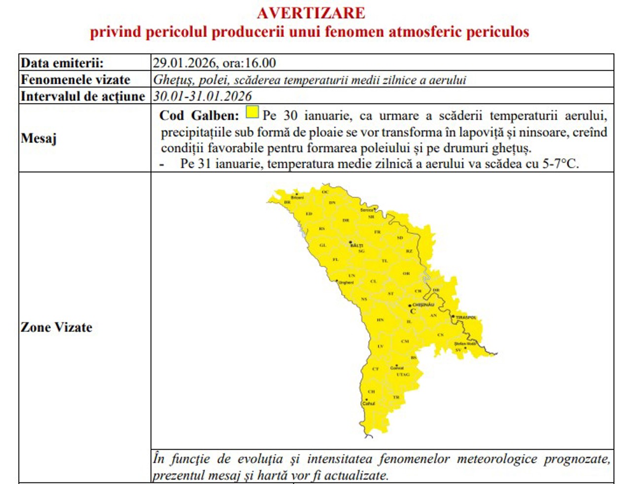 Pe 30 ianuarie, ca urmare a scăderii temperaturii aerului, precipitațiile sub formă de ploaie se vor transforma în lapoviță și ninsoare, creând condiții favorabile pentru formarea poleiului și a ghețușului pe drumuri. Pe 31 ianuarie, temperatura medie zilnică a aerului va scădea cu 5-7°C.