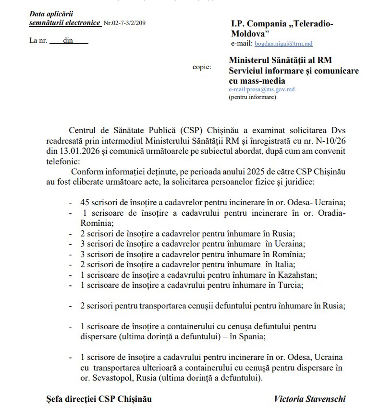 Potrivit datelor Centrului de Sănătate Publică Chișinău, pe parcursul anului 2025 au fost eliberate 45 de scrisori de însoțire pentru incinerarea cadavrelor în Odesa, Ucraina, și o scrisoare pentru incinerare în Oradea, România.