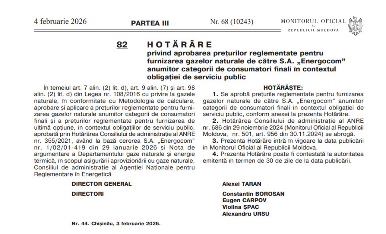 Consumatorii casnici din Republica Moldova plătesc, începând de miercuri, 4 februarie, mai puțin pentru gazele naturale. Reducerea intră în vigoare odată cu publicarea deciziei Agenției Naționale pentru Reglementare în Energetică (ANRE) în Monitorul Oficial.