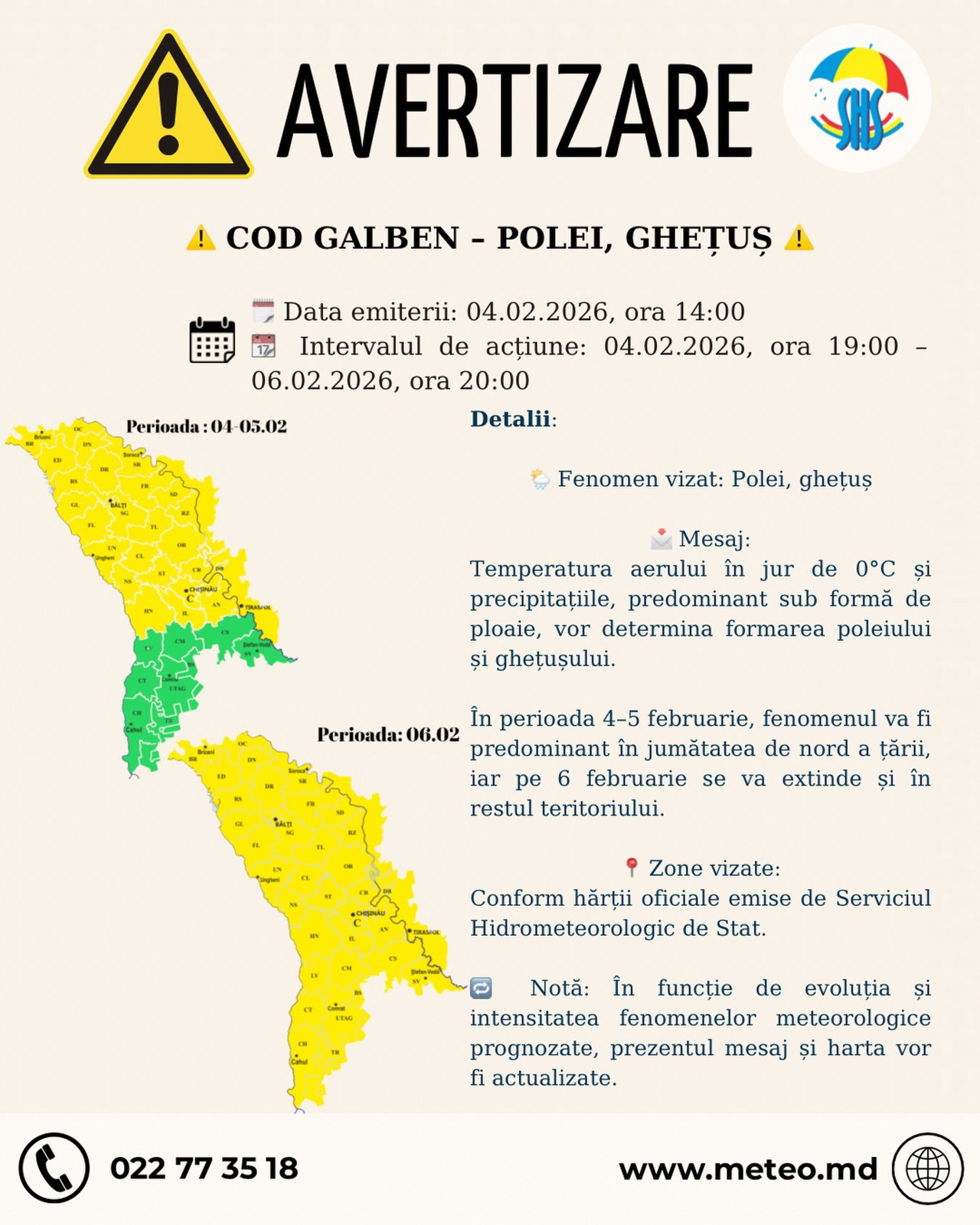 В Центре и на юге Молдовы объявили предупреждение о гололёде и обледенении. Предупреждение действует 4 и 5 февраля в северном и центральном регионах, а 6 февраля непогода ожидается по всей стране. Синоптики прогнозируют дожди и температуру около нуля.