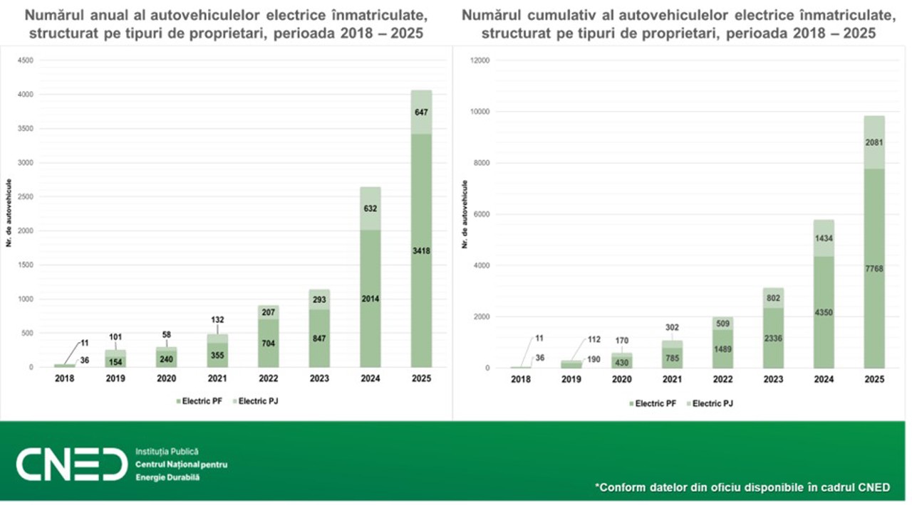 În 2025, persoanele fizice au înmatriculat 3.418 autovehicule electrice și 22.790 de autovehicule hibride, în timp ce persoanele juridice au înregistrat 647 de vehicule electrice și 3.712 hibride.