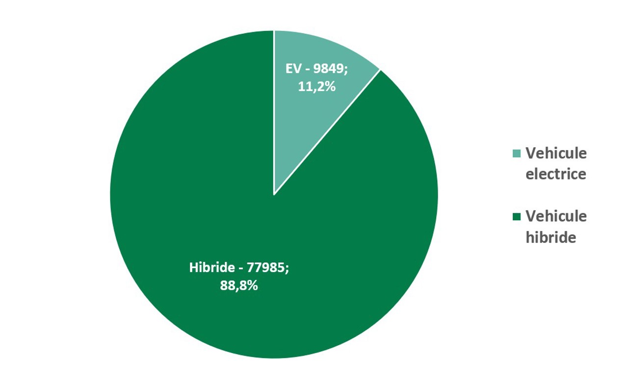 Din numărul total al vehiculelor eficiente din punct de vedere energetic, 11.2% sunt electrice, respectiv 9.849 de unități, dintre care 7.768 au fost înmatriculate de persoane fizice, iar 2.081 - de persoane juridice.