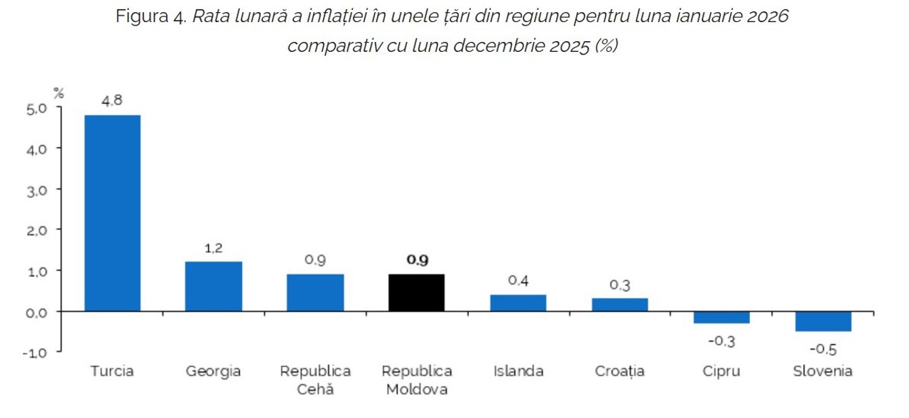 În comparație cu alte țări din regiune, în ianuarie 2026, Republica Moldova a înregistrat o inflație similară cu cea din Cehia, mai mare decât în Islanda și Croația, însă sub nivelul din Georgia și Turcia.