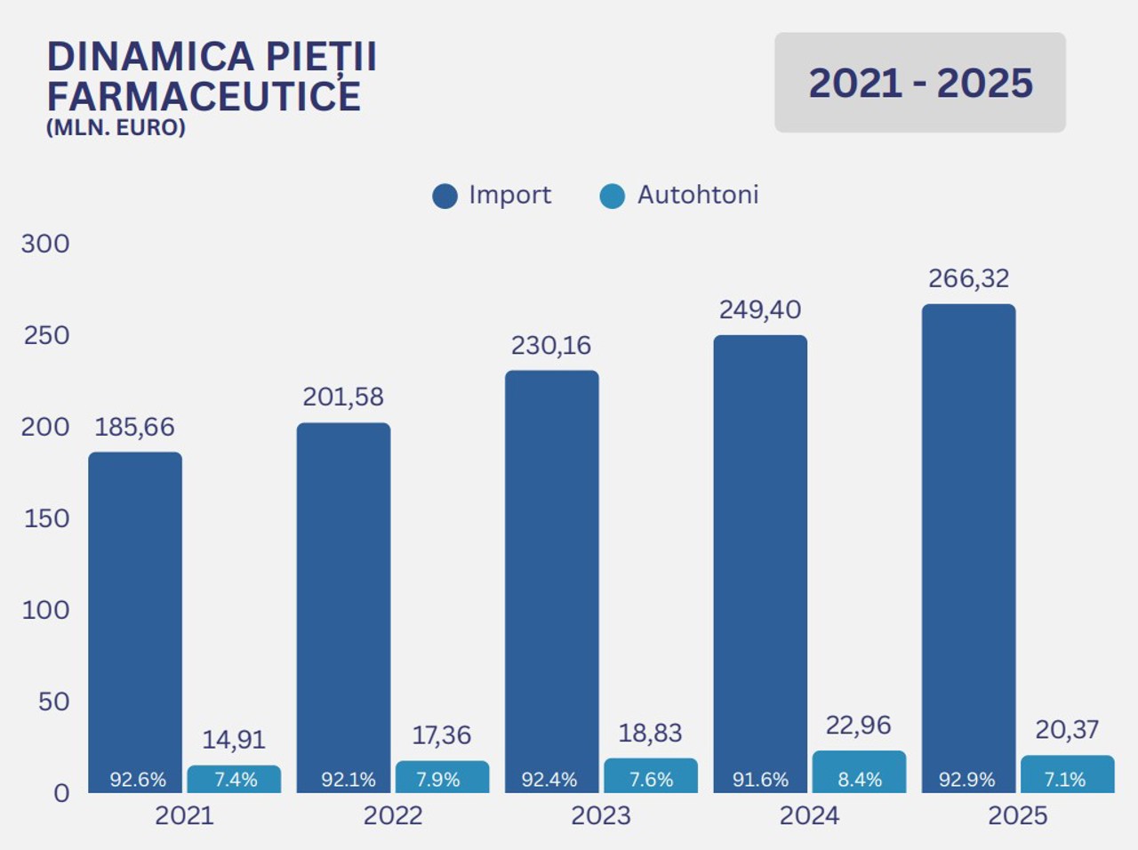 While production grows, the domestic market remains dominated by imports, which accounted for 92.89% of the €866.7 million (approx. 17.07 billion MDL) total market value in 2025. Local manufacturers provide 13.8% of the market volume but only 7.1% of its value, highlighting the affordability of domestic drugs.