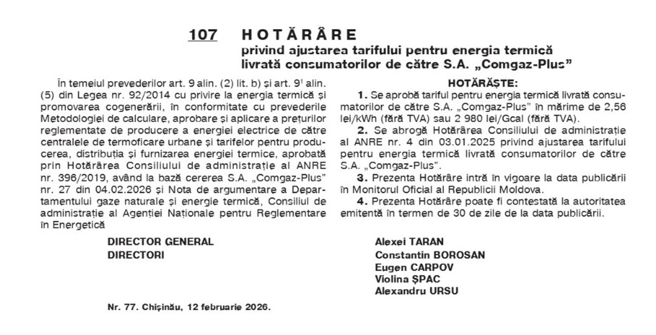 La Comrat, pentru operatorul „Rețele și Centrale Termice”, tariful pentru energia termică a fost stabilit la 3.505 lei/Gcal, ceea ce reprezintă o reducere de aproximativ 240 de lei față de tariful anterior.