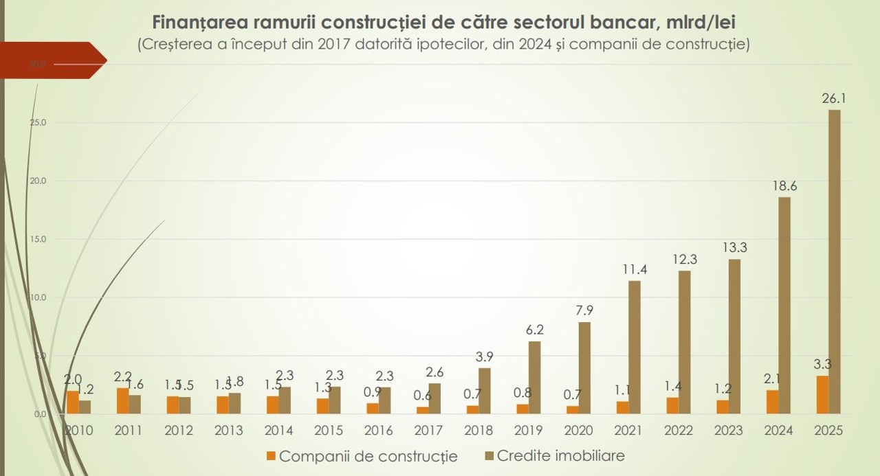 În ultimii zece ani, portofoliul creditelor bancare pentru imobile a crescut semnificativ, de la 3.7 miliarde lei în 2015 la 29.4 miliarde lei în 2025, cu o explozie a creditelor ipotecare în ultimii doi ani. Din această sumă însă, doar 3.3 miliarde lei reprezintă creditele acordate companiilor de construcții.
