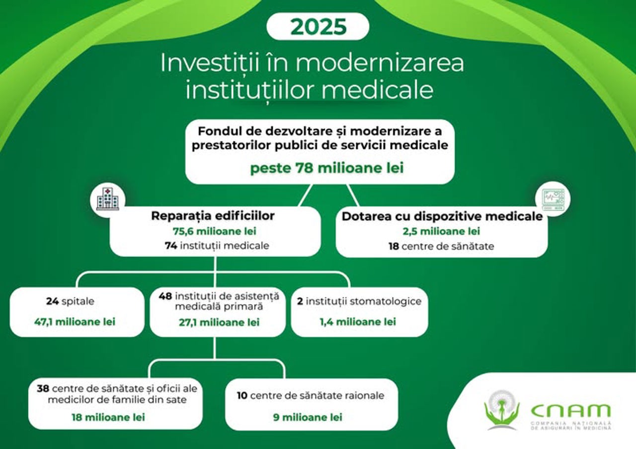Din bugetul de peste 78 de milioane de lei alocat de CNAM, 75.6 milioane de lei au fost investiți în renovarea a 74 de edificii medicale. Iar 2.5 milioane de lei au costat dispozitive medicale achiziționate pentru laboratoare, servicii de fizioterapie și diagnostic rapid.