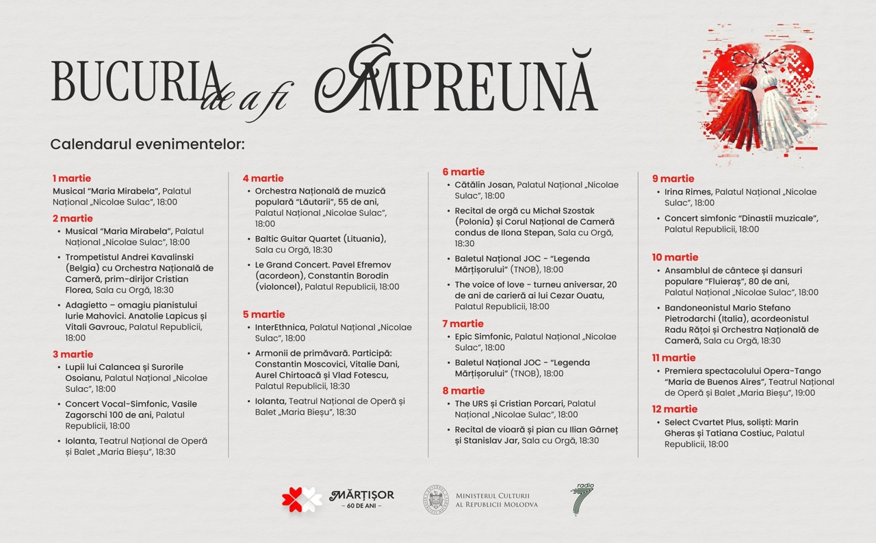Ediția jubiliară a Festivalului Internațional de Muzică „Mărțișor” va avea loc, în perioada 1-12 martie, la Chișinău. Cea de-a 60-a ediție a festivalului cultural va reuni peste 20 de evenimente: concerte simfonice, operă, balet, recitaluri camerale și proiecte speciale. Genericul din acest an este „Bucuria de a fi împreună”.