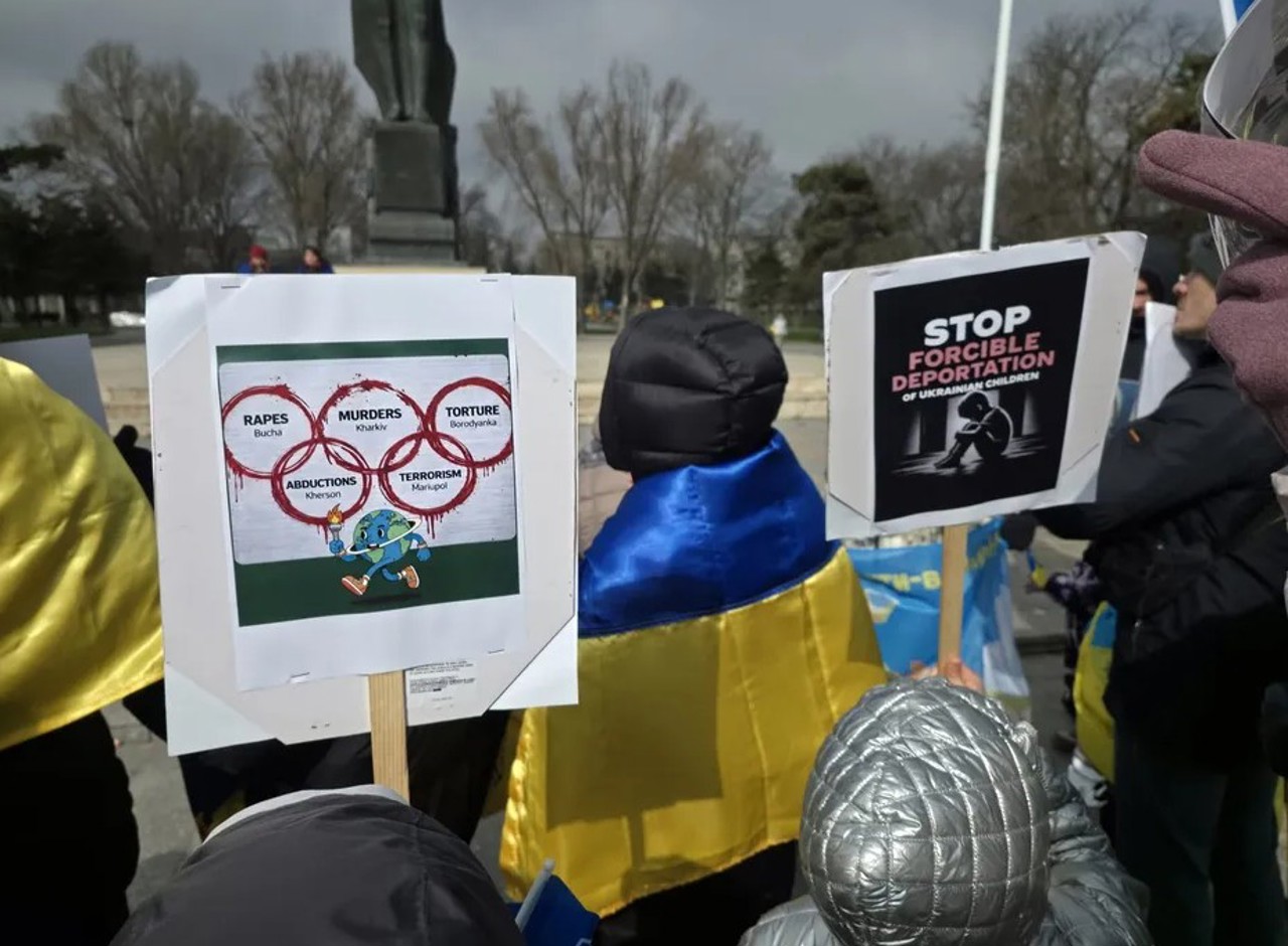 Steaguri ale Ucrainei sunt fluturate, dar și pancarte cu „stop deportarea copiilor ucraineni”, „crime”, „răpiri”, „torturi”.