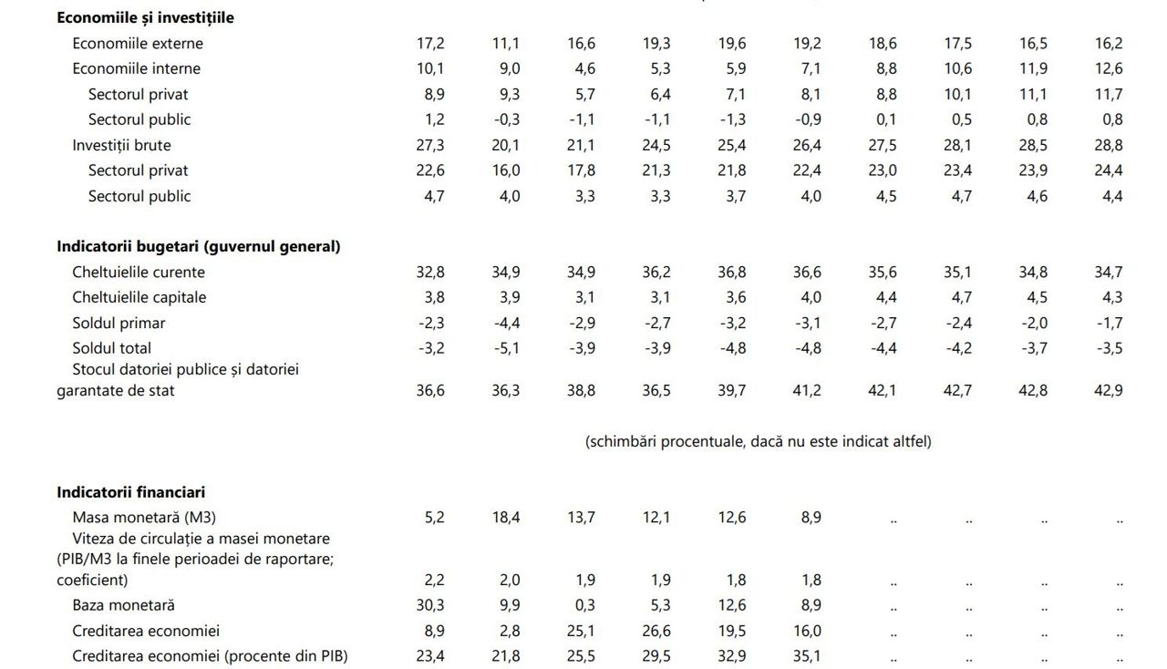 Datoria publică este estimată să crească treptat, ajungând la aproape 40% din PIB în 2026, potrivit datelor din raport (tabelul indicatorilor economici, pag. 4).