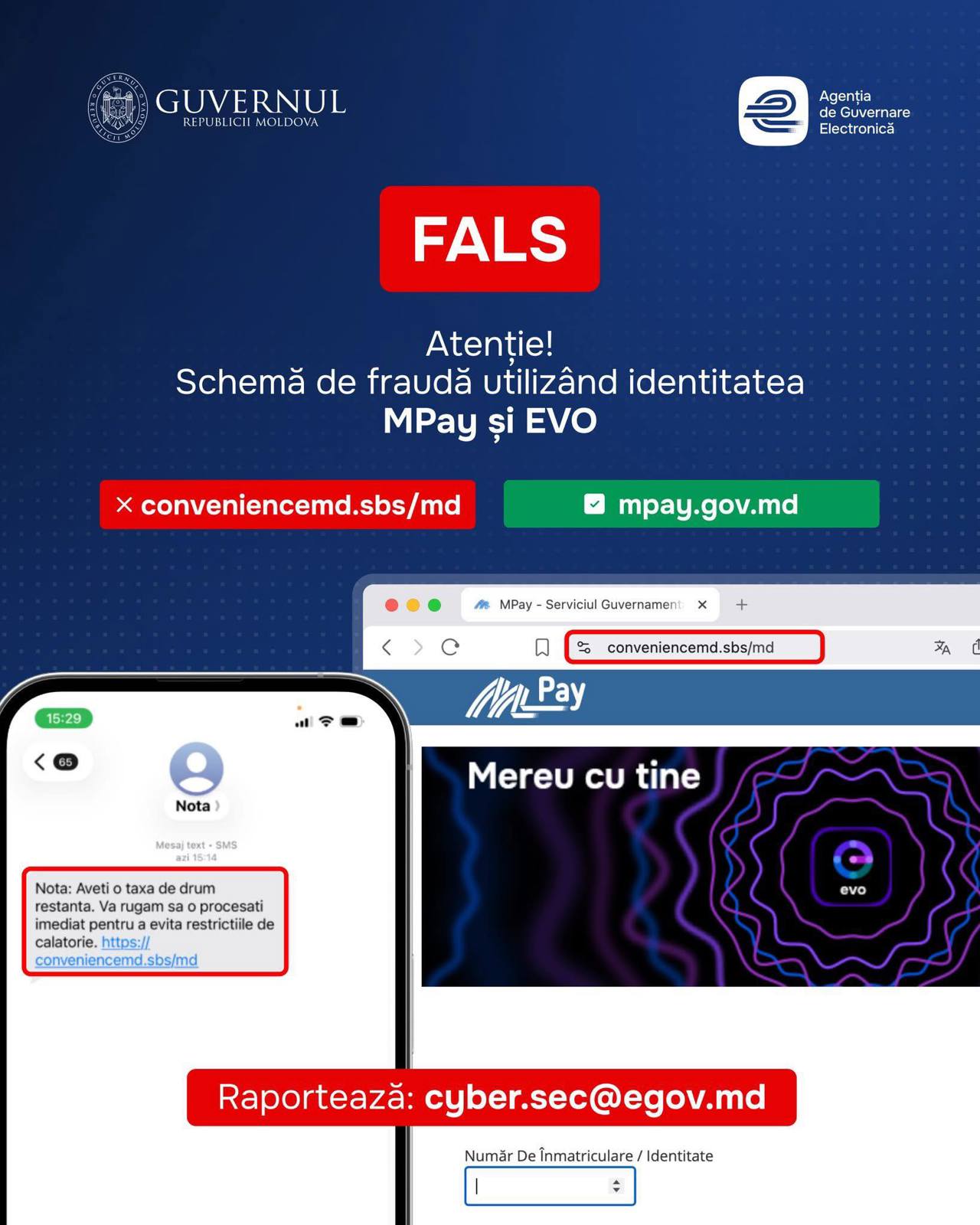 The official platform for tax payments is mpay.gov.md. Neither MPay nor EVO sends unauthorised SMS links requesting urgent tax payments.