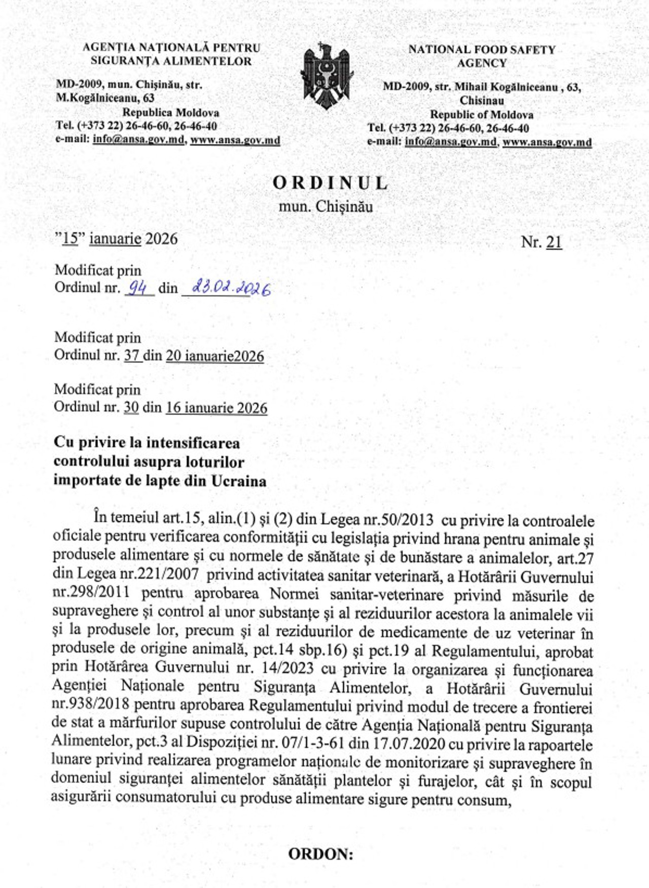 „Ordinul din 23 februarie 2026, emis de Agenția Națională pentru Siguranța Alimentelor, reduce controalele la loturile de lapte din Ucraina, eliminând monitorizarea consolidată a laptelui ambalat”, se arată în comunicatul instituției.