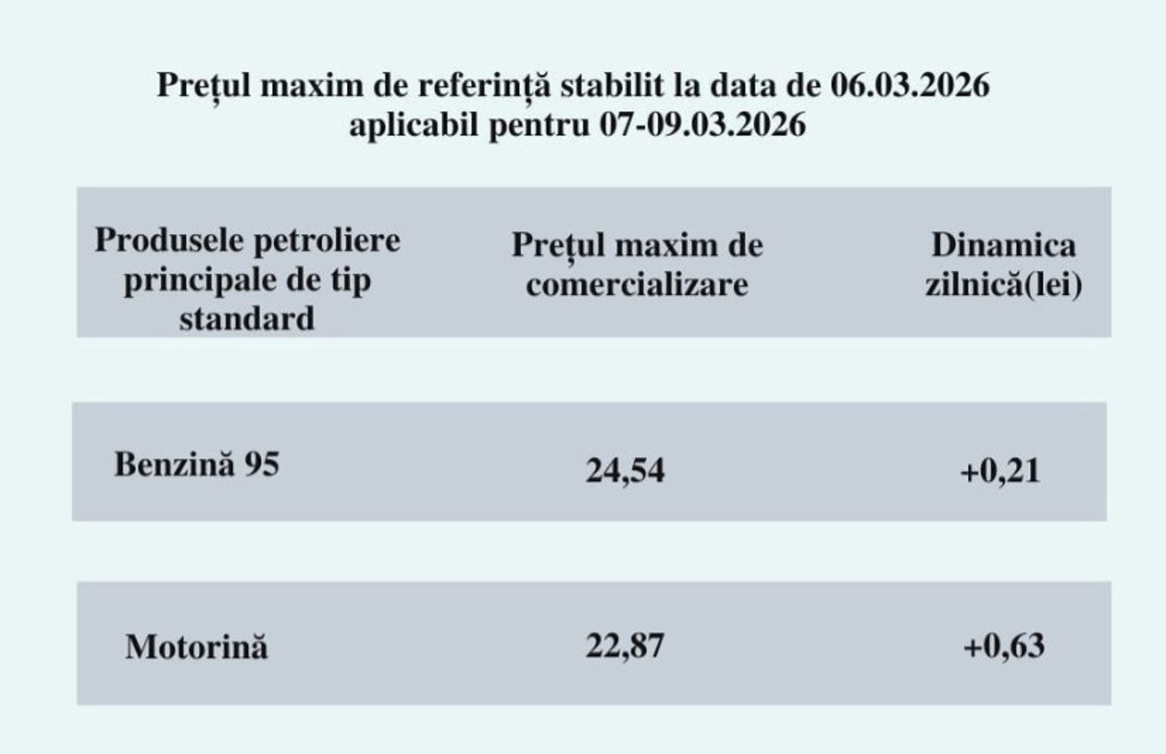 Potrivit prețurilor-plafon, stabilite de Agenția Națională pentru Reglementare în Energetică (ANRE) pentru perioada 7 – 9 martie, motorina se va scumpi cu 63 de bani, iar benzina – cu 21 de bani.