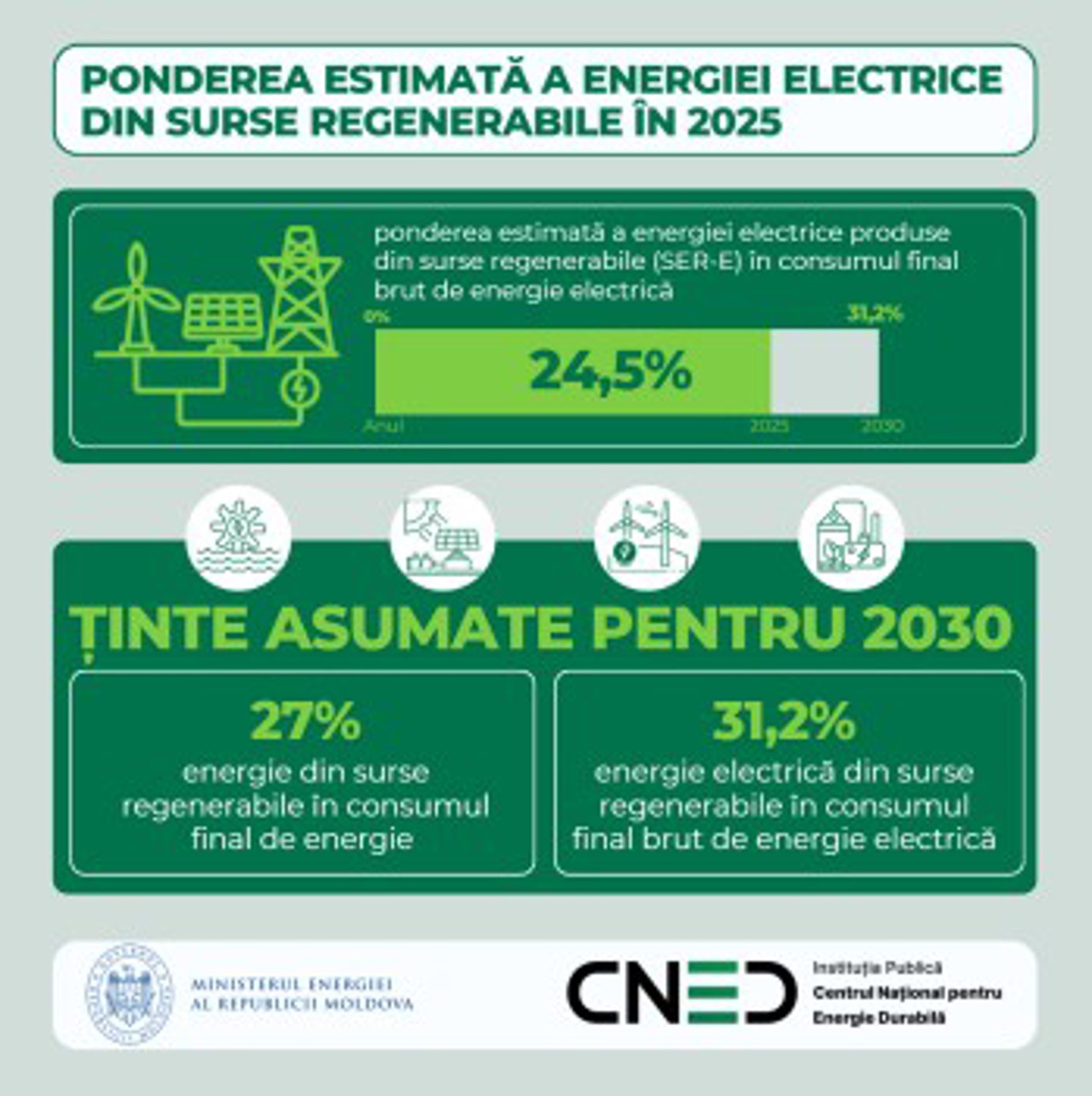 Aproape un sfert din energia electrică consumată pe parcursul anului 2025 în Republica Moldova a provenit din surse regenerabile. Creșterea ponderii energiei verzi a fost determinată de numărul tot mai mare de producători și de extinderea rapidă a capacităților instalate la nivel național, susține Centrul Național pentru Energie Durabilă (CNED).