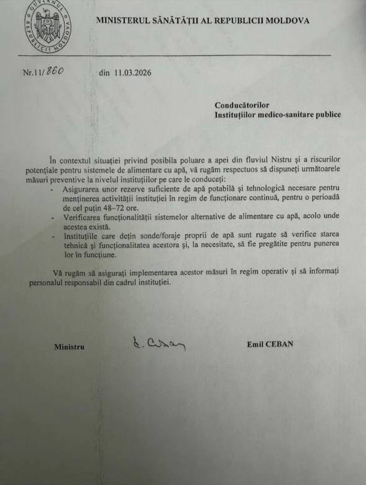 Totuși, Ministerul Sănătății a solicitat instituțiilor medicale din Chișinău să facă rezerve de apă suficiente pentru „cel puțin 48 - 72 de ore”, ca măsură preventivă vizavi de o eventuală sistare a livrărilor centralizate din cauza unei „posibile poluări a fluviului Nistru”.