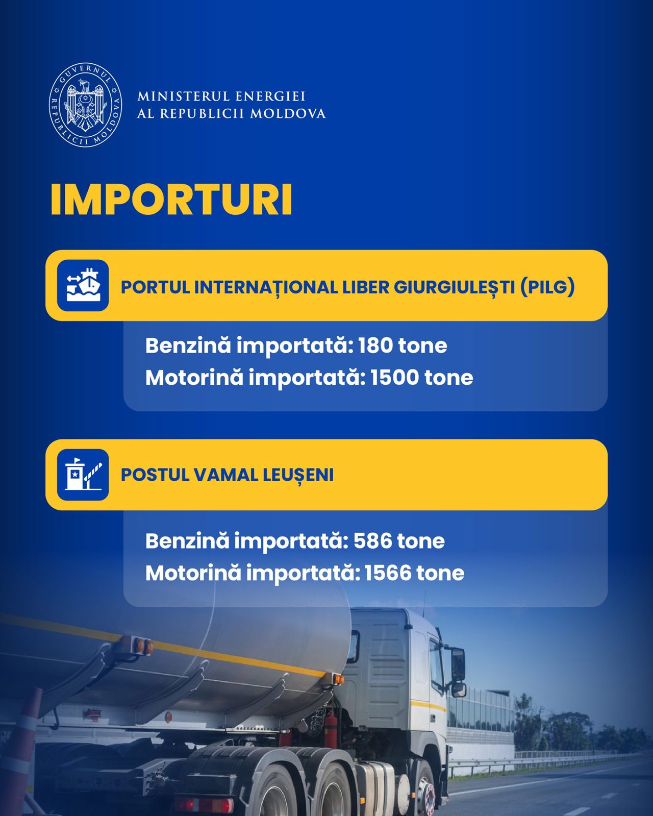 Potrivit acestuia, autoritățile monitorizează constant situația aprovizionării cu carburanți. Ministrul a precizat că, în cursul zilei, prin Portul Internațional Liber Giurgiulești au fost importate 180 de tone de benzină și 1.500 de tone de motorină. În același timp, prin postul vamal Leușeni au intrat în țară alte 586 de tone de benzină și 1.566 de tone de motorină.