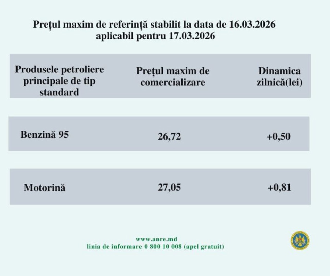 Potrivit prețurilor plafon stabilite de Agenția Națională pentru Reglementare în Energetică (ANRE) pentru ziua de 17 martie, motorina se va scumpi cu 81 de bani și va costa 27.05 lei.