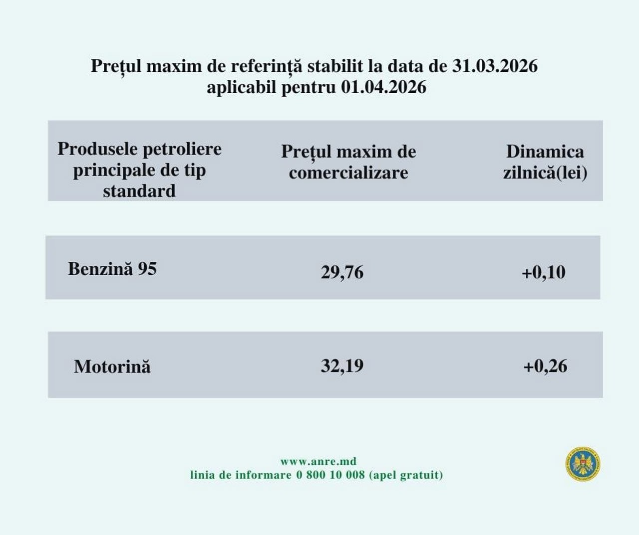 Potrivit prețurilor-plafon, stabilite de Agenția Națională pentru Reglementare în Energetică (ANRE) pentru ziua de 1 aprilie, un litru de motorină va fi comercializat, pe 1 aprilie, cu maximum 32.19 lei, cu 26 de bani mai mult decât astăzi.