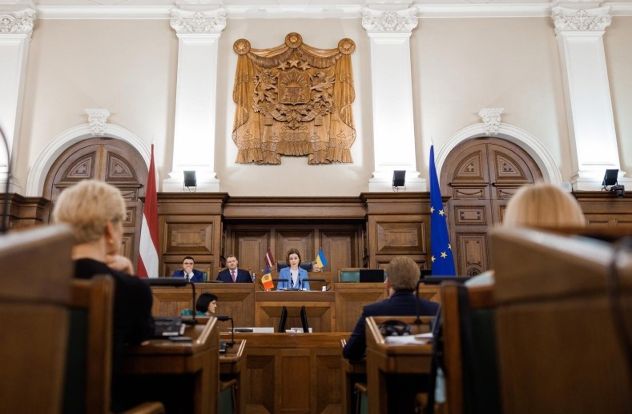 Președinta Maia Sandu a cerut Letoniei, la finalul discursului, să fie „vocea Moldovei la Bruxelles”, amintind că lupta împotriva forțelor care divizează Europa începe de la frontierele estice.