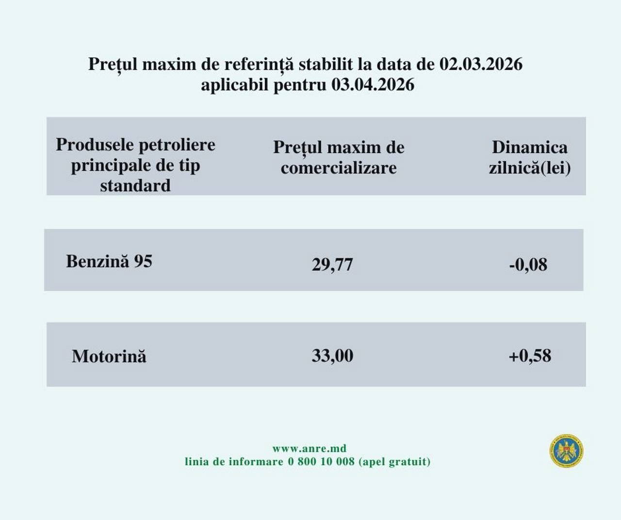 Și benzina a urmat un trend ascendent, însă într-un ritm mai moderat. Pentru 3 aprilie, ANRE a stabilit un preț maxim de 29.77 lei/litru pentru benzina COR 95, în ușoară scădere cu 8 bani față de ziua precedentă.