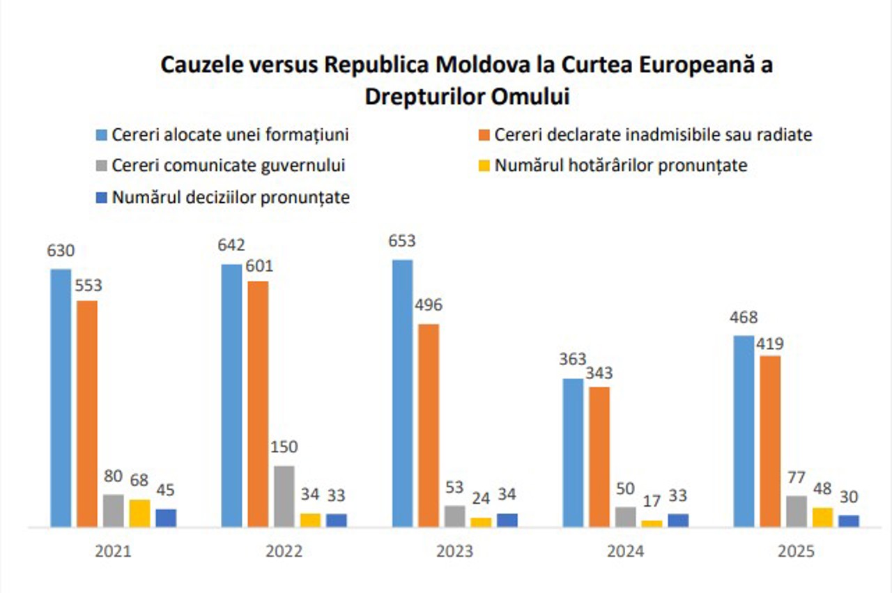 Ministrul Justiției, Vladislav Cojuhari, a subliniat în ședința Executivului că agentul guvernamental a prezentat, în anul 2025, către Comitetul de Miniștri al Consiliului Europei (organul responsabil de monitorizarea executării hotărârilor Curții Europene) 42 de planuri de acțiune, rapoarte și comunicări, fapt care a permis încetarea supravegherii a 34 de cauze prin adoptarea de rezoluții finale.