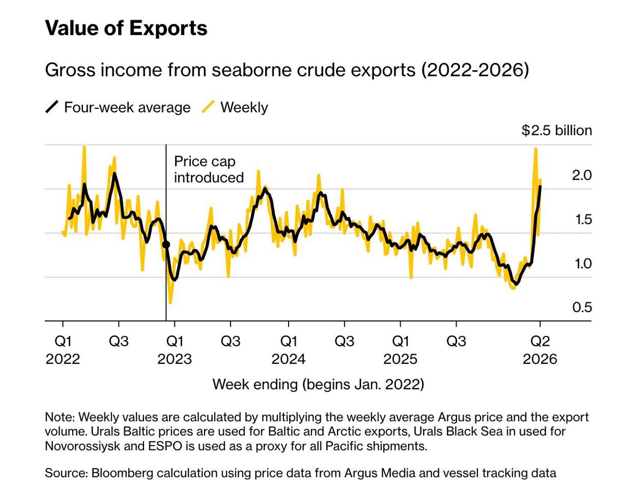 Rusia obține din exporturile de petrol mai mult decât oricând de la primele săptămâni ale războiului de amploare împotriva Ucrainei, datorită creșterii accentuate a prețurilor și a volumelor livrate, a relatează agenția Bloomberg, citată de Meduza Live.