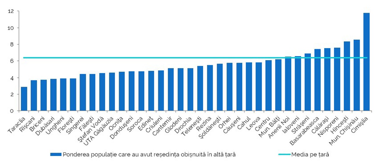 Din punct de vedere teritorial, ponderea populației urbane care a locuit peste hotare mai mult de un an este cu trei puncte procentuale mai mare decât cea a populației rurale: 8% comparativ cu 5.1%.