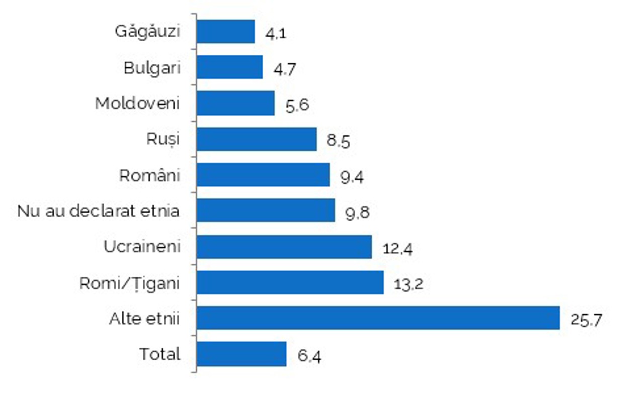Analiza profilului etnic arată că cea mai mare pondere a persoanelor care au avut reședință peste hotare se regăsește în rândul romilor: 13.2% din totalul populației acestei etnii, urmați de ucraineni: 12.4%.