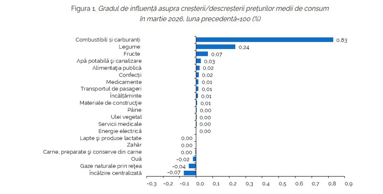 Principalul factor de presiune asupra prețurilor în luna martie a fost scumpirea carburanților, alături de creșterea prețurilor la legume. În același timp, ieftinirea ouălor și reducerea tarifelor la gaze naturale și la încălzirea centralizată au temperat avansul inflației.