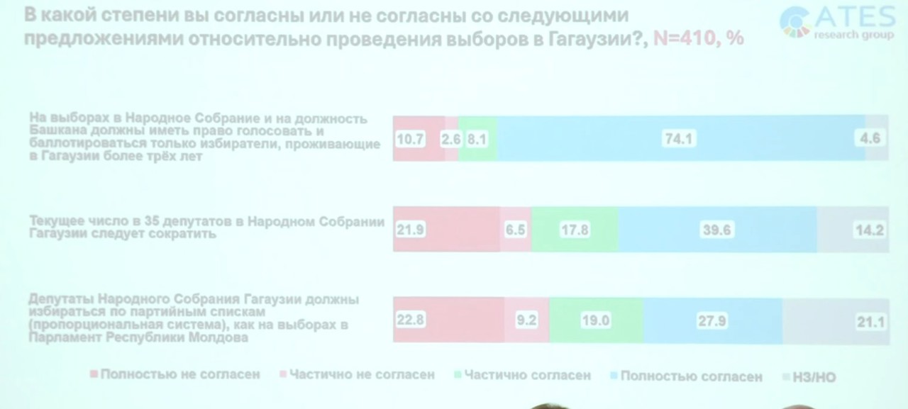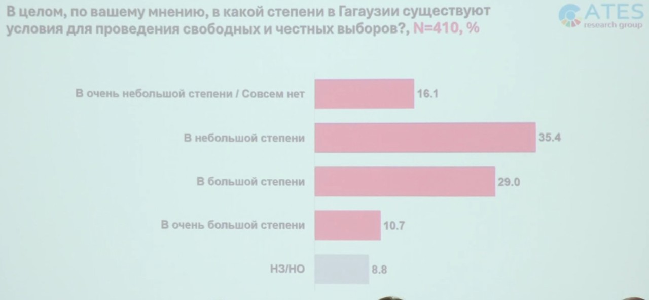 Potrivit studiului, circa 40% dintre respondenți consideră că în UTA Găgăuzia există condiții care ar asigura organizarea unor alegeri libere și corecte, în timp ce peste 35% apreciază că actualele condiții sunt doar într-o mică măsură favorabile unui scrutin democratic.