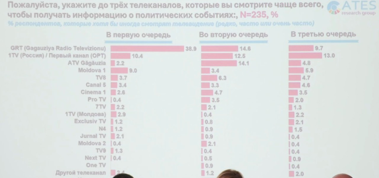 Principalele canale TV urmărite pentru informații politice sunt GRT (Gagauziya Radio Televizionu) – 63%, 1TV Rusia – 36% și ATV Găgăuzia – 22%. Dintre posturile în limba română, cele mai vizionate sunt Moldova 1 – 18%, TV8 – 14% și Canal 5 – 12%.