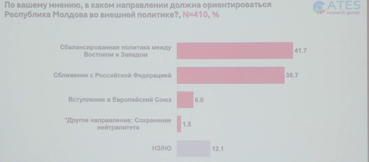 Sondajul relevă o discrepanță semnificativă în privința direcției geopolitice a țării: apropierea de Federația Rusă este susținută de 39% dintre respondenți, în timp ce integrarea în UE este salutată de doar 6%.