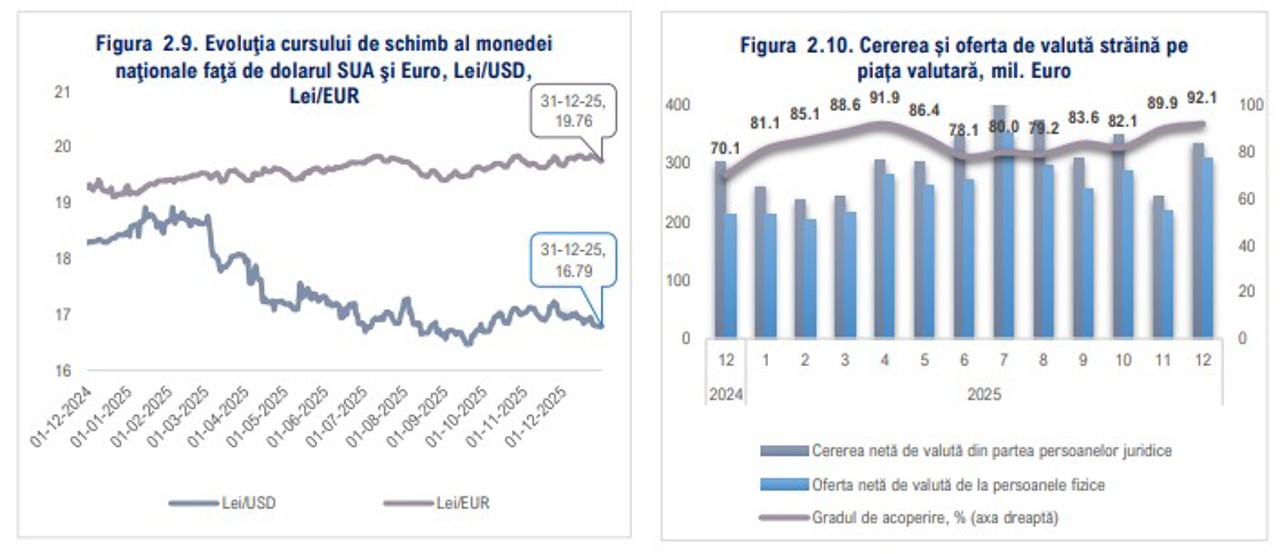 În același timp, față de dolarul SUA, leul moldovenesc s-a apreciat cu 9.1%, cursul de schimb ajungând la 16.79 lei pentru un dolar în decembrie 2025. Per ansamblu, raportat la coșul principalelor valute, leul moldovenesc s-a menținut pe o tendință de apreciere.