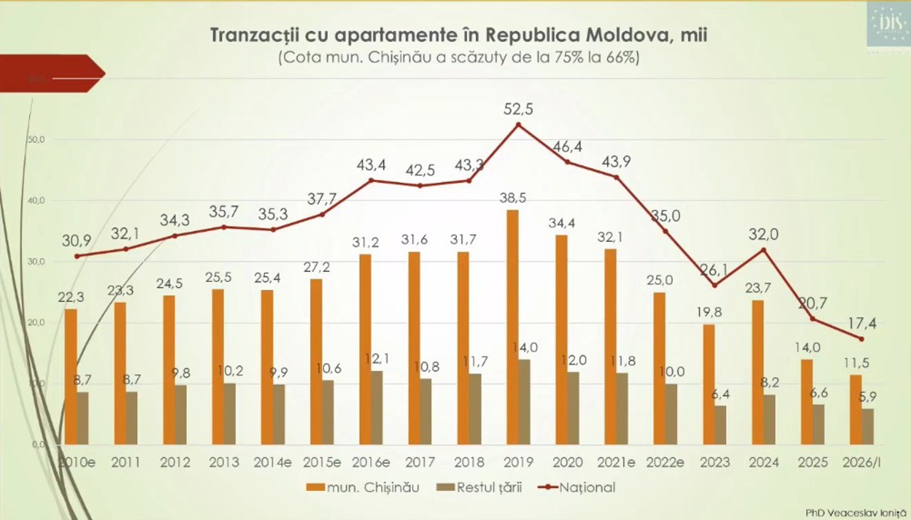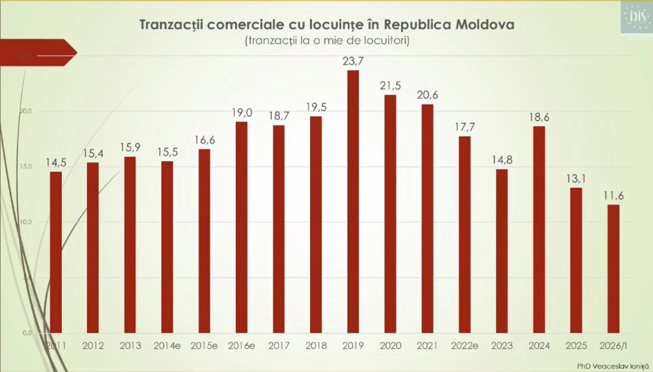 Piața locuințelor din Republica Moldova intră într-o etapă de stabilizare, după ce a fost marcată de o reducere vizibilă a numărului de tranzacții. Totuși, acest lucru nu ar reprezenta un declin dramatic, ci mai degrabă o ajustare structurală după o perioadă de creștere rapidă și explozie a prețurilor din anii anteriori, Mai exact, cumpărătorul final a rămas „constant”, dar au dispărut investitorii și intermediarii, afirmă expertul economic Veaceslav Ioniță.