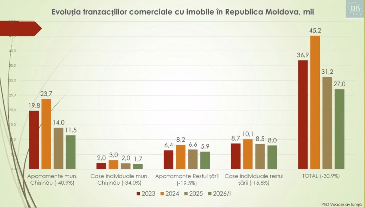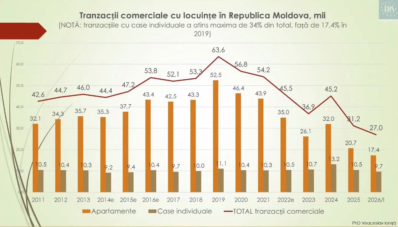 „În ultimele 12 luni, au fost înregistrate 27 de mii de tranzacții în toată țara, dintre care 17.400 au vizat apartamentele și 9.700 - casele individuale. Cifra caselor individuale este aproape de media constantă – în jur de 10 mii anual. Ceea ce a scăzut sunt apartamentele: în 2019 au fost 52.500 de tranzacții în țară, acum am coborât la 17.400”, a precizat Veaceslav Ioniță.