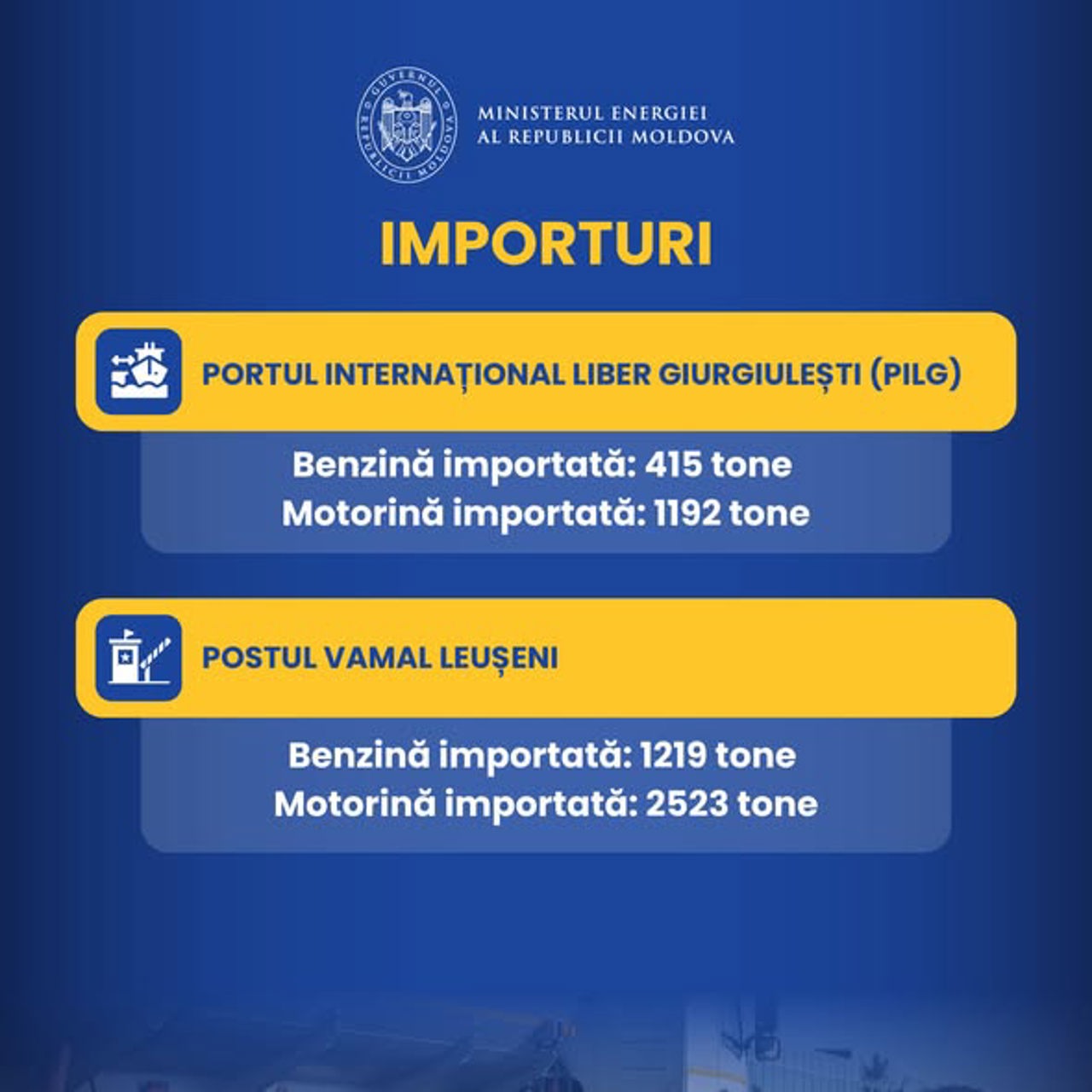 Republica Moldova dispune de suficiente stocuri de carburanți. În perioada 24-26 aprilie, au fost importate peste 1.600 de tone de benzină și mai mult de cinci mii de tone de motorină, potrivit datelor Ministerului Energiei.