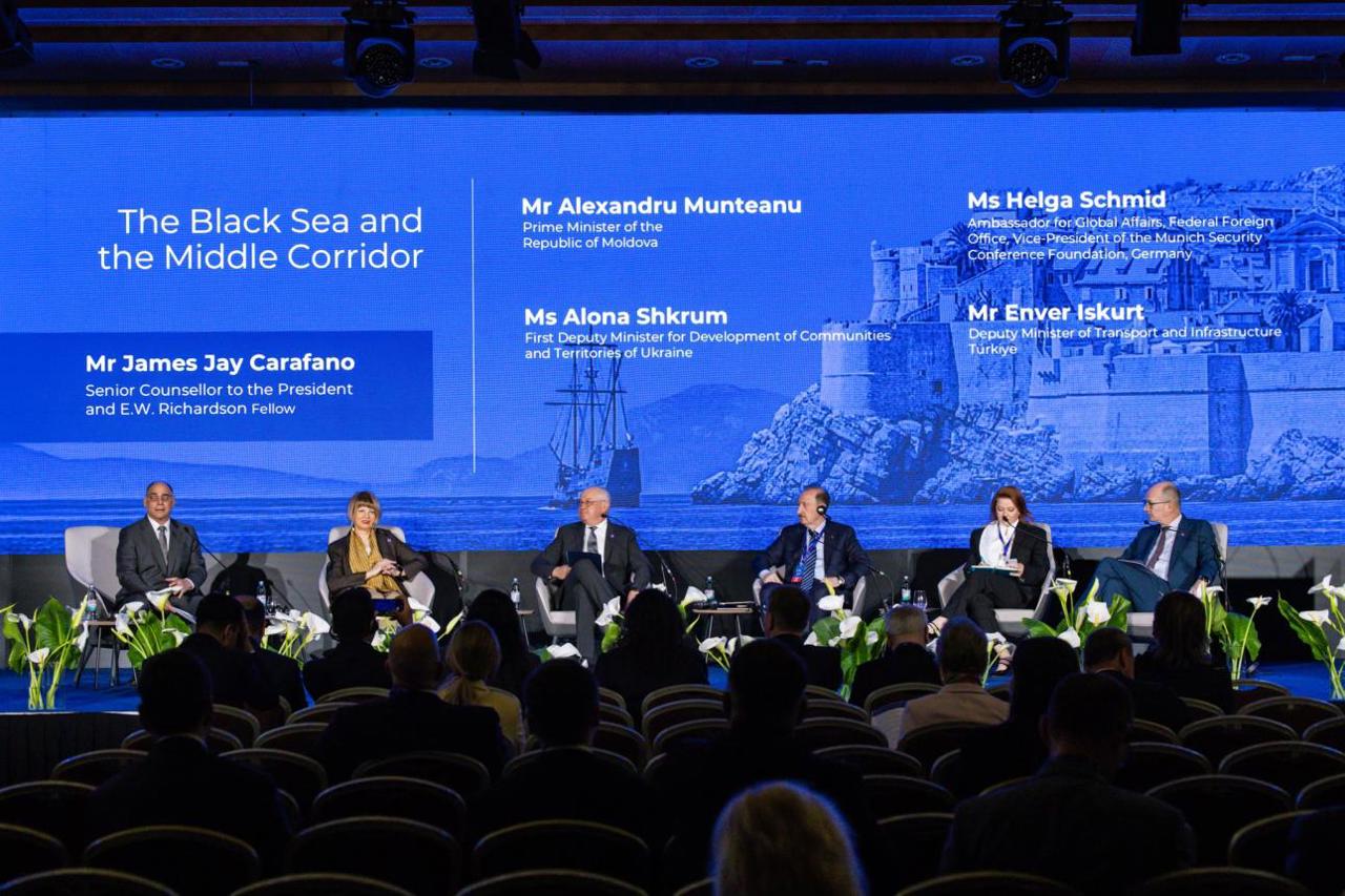 În cadrul panelului „Marea Neagră și Coridorul de Mijloc”, șeful Executivului de la Chișinău a evidențiat rolul tot mai important al acestei rute, care leagă Asia Centrală, Caucazul, Turcia și regiunea Mării Negre, pe fondul perturbării fluxurilor comerciale după 2022.
